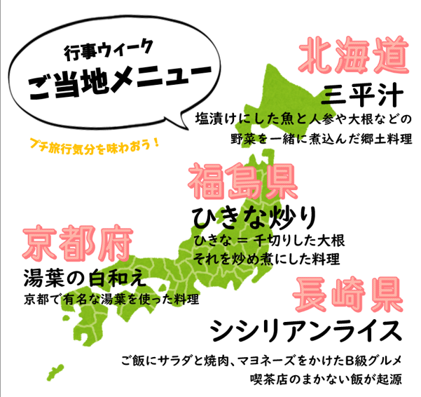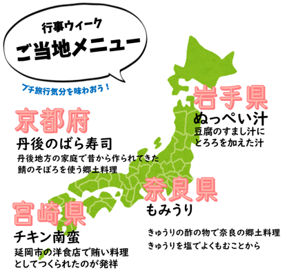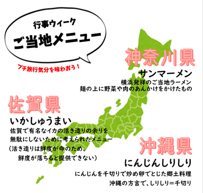 デイサービスセンター · 10月 31日, 2022年 【デイ】10月行事食 ●行事ウィーク● 行楽シーズンの季節! でも、なかなか外出できないこのご時世・・・ そんな中少しでも旅行気分を味わっていただくために、 今月の行事ウィークはご当地メニューです✈ 「珍しいもの食べられたわぁ~」と喜ばれていました✨ tagPlaceholderカテゴリ: コメントをお書きください コメント: 0